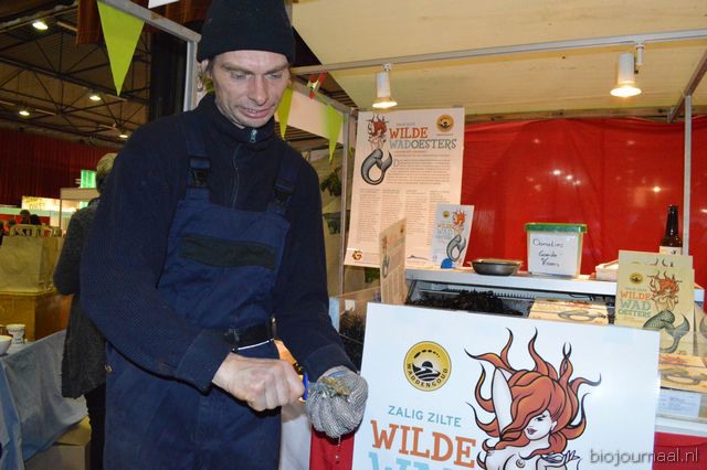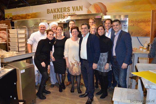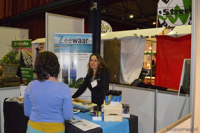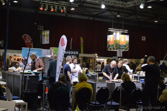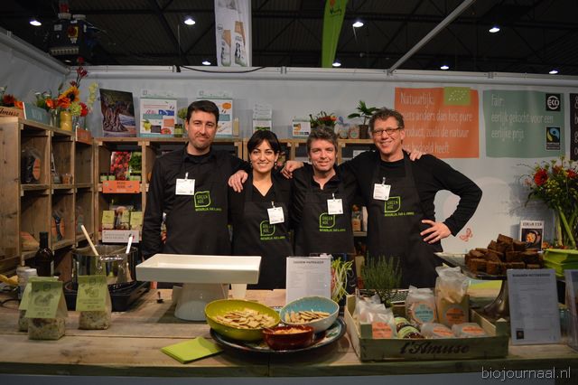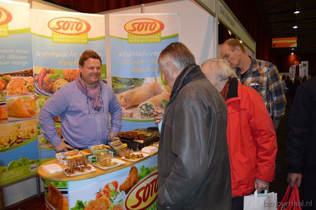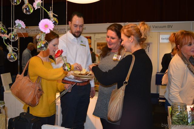 "Daar lieten Rob en Francien Hohmann (derde van links) proeven van de nieuwe producten van ProLaTerre: Zeeuwse Zeewierballen en Tofulicious Wok-varianten. ProLaTerre maakte haar debuut op de Bio-beurs en Francien toonde zich op de eerste dag al tevreden: "Wat een leuke beurs!"