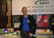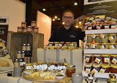 "Allard ten Dam toont een nieuw product van De Nieuwe Band: hagelslag puur met een extra hoog cacaogehalte van 50%. Hij heeft het weer zichtbaar naar zijn zin: "Dit is altijd zo'n leuke beurs."