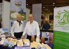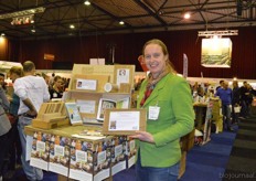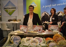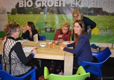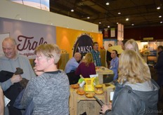 Marja Bastiaansen is maar al te trots dat ze bezoekers op de Bio-beurs kon laten proeven van de drie nieuwe varianten kruidenbrie: brie met een Italiaans kruidenmengsel, een variant met honing-klaver en brie met wilde knoflooksmaak.