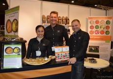 Pantaree Pantitat, Onno Stienen en Rogier Hardeman van onoff spices! Ze lieten bezoekers proeven van biologische Thaise khao soi soep, een romige, zoete en mild-pittige kokossoep, die traditioneel geserveerd wordt met kipkluiven, noedels, taugé en kool. Rogier gaat onoff spices! op de Duitse markt vertegenwoordigen.