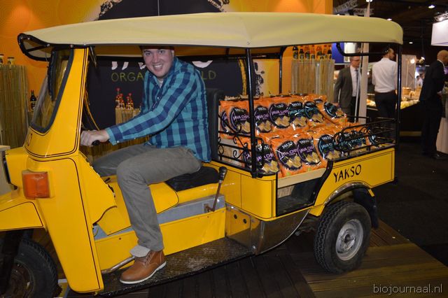 "Dit keer was er een tuktuk te vinden in de stand van FZ Organic Food. Pieterjan Kok: "Dit vonden we goed passen bij ons merk Yakso." Yakso is het merk voor de biologische consument die graag geniet van de gevarieerde Aziatische keuken. De afgelopen maanden zijn diverse nieuwe producten toegevoegd aan het assortiment van Yakso, waaronder biologische gebakken uitjes, eiermie, rijstnoedels en kokosbloesemsuiker en -siroop."