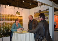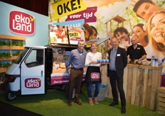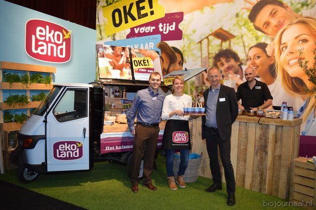 Roelof Hulst, Anne van Woudenberg en Eric van Gool in de 'Ekoland-helft' van de stand van Natudis, met achter hen de Ekoland foodtruck.