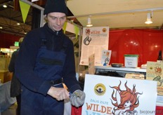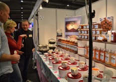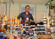 Een stand vol delicatessen van de Waddeneilanden. Christiaan Snouck Hurgronje vertelt dat de duindoorn-cranberryjam nieuw in het assortiment is.