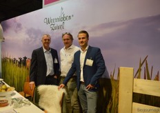 Wim Meure-Buren, Klaas de Lange en Thijs de Lange van Weerribben Zuivel, met achter hen de koeien die grazen in het natuurgebied Weerribben.