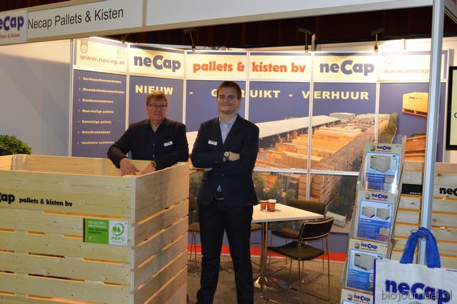 Mart en Piet Broers van pallet- en kistenhandel Necap toonden een robuuste kuubkist van PEFC gecertificeerd hout.