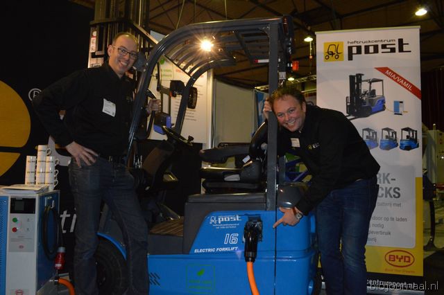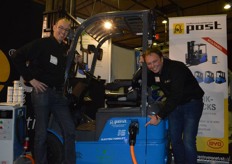 Stefan Davids en Berthold van Dommelen van Post Heftruckcentrum wijzen op de elektrische heftruck. De lithiumbatterij heeft een lange levensduur en geen warmteontwikkeling. Daardoor is de batterij 40% efficiënter.