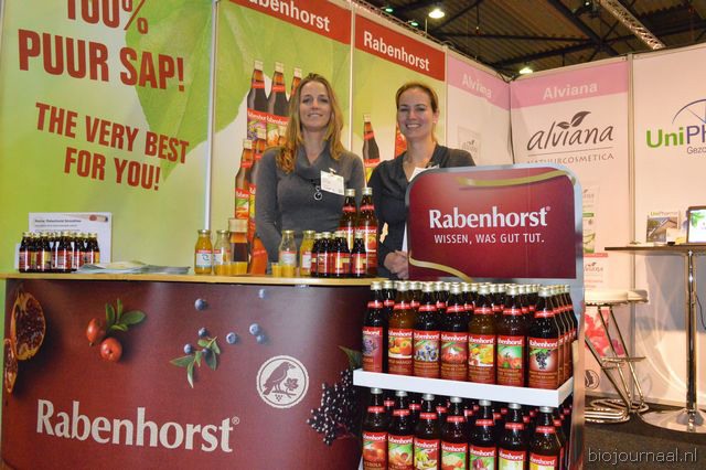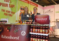 Melanie Verbart en Annemieke Wondergem (UniPharma) tonen de Rabenorst sappen. De stand en de sappen zijn beschikbaar voor instore-promoties.