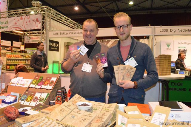 Norbert Mergem en Daan Koemans tonen de producten van ClearChox. Het bedrijf handelt in chocolade, waarbij transparantie binnen de keten doorslaggevend is.