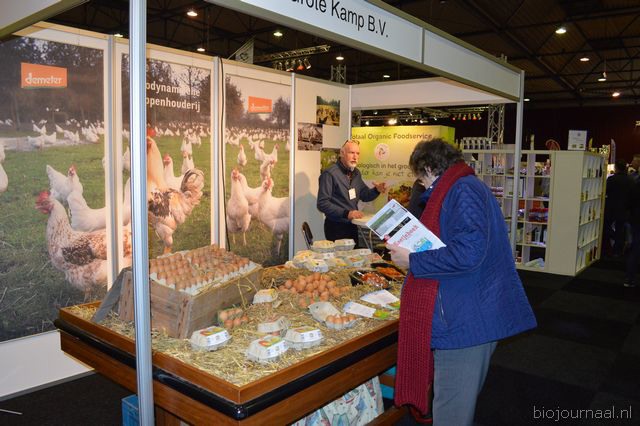 "Henk Spruijt en Wim Thomassen in de stand van Biomeerwaarde Ei. Wim: "We zijn blij met het resultaat, het is een mooie pleintje geworden. We krijgen er goede reacties op. Sommigen zouden hier een paar uur rond kunnen lopen." Wim runt biologisch pluimveebedrijf de Zandschulp in Overberg, waar volgens de vakjury in 2015 de mooiste kippenuitloop te vinden was."