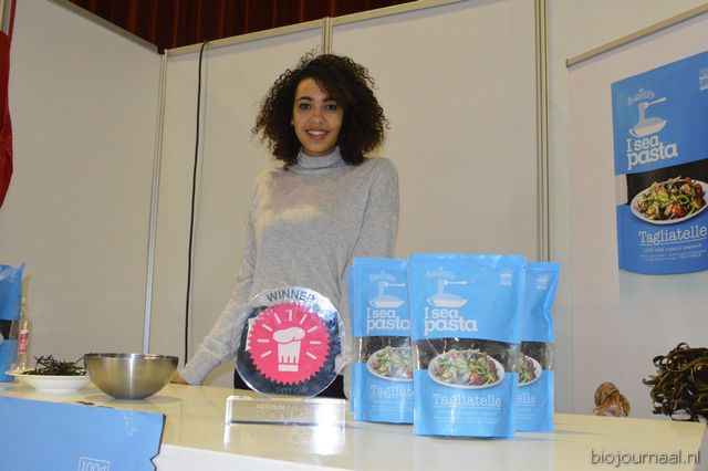 Lelani van Seamore presenteert deze gedroogde zeewier. Na koken lijkt de zeegroenten op tagliatelle. En 2015 won dit product de Ketchum Europe Foodlab-prijs, de trofee kreeg een prominente plek op de stand.