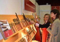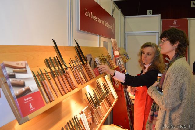 "Giselheid Herder-Scholz van Molenmes toont een bezoeker het brede assortiment messen. "We zijn al lang actief op de Nederlandse markt en we hebben al heel lang een biologische werkwijze, maar we zijn dit jaar voor het eerst op de beurs."