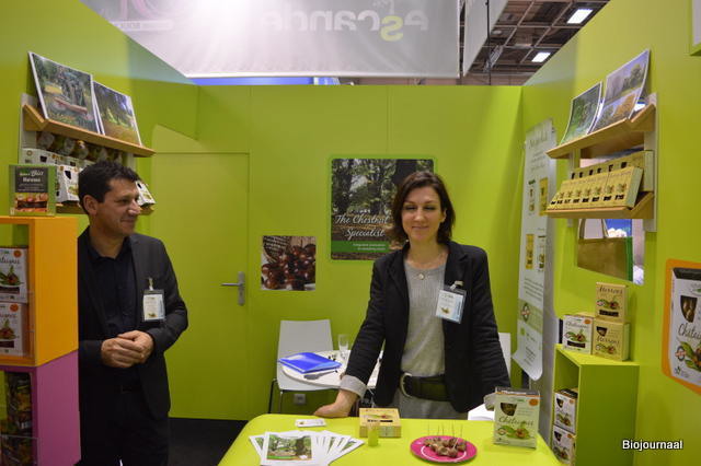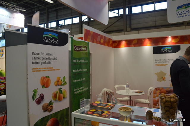 Christine Bonnet presenteert Coopenoix, een Frans bedrijf dat onder andere walnoten en biologisch hardfruit teelt in Grenoble. Even bescheiden als enthousiast heeft ze liever alleen de stand in beeld.