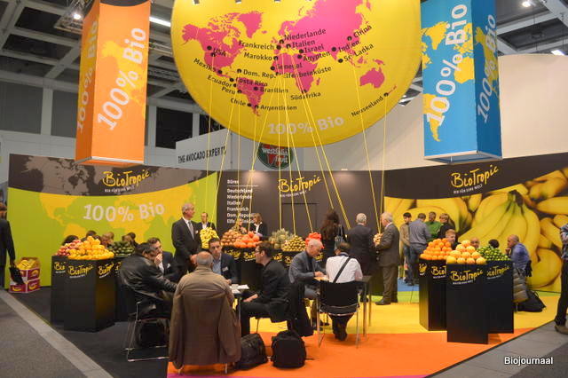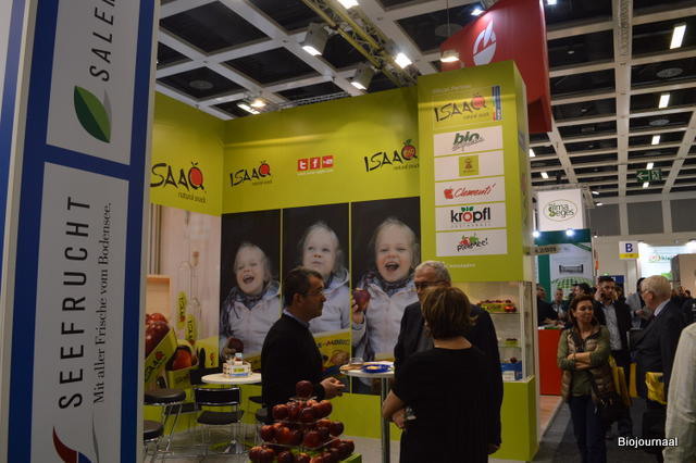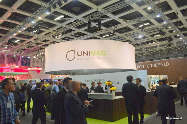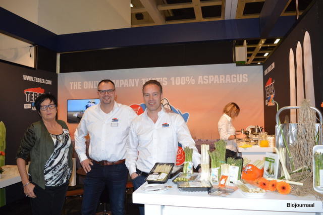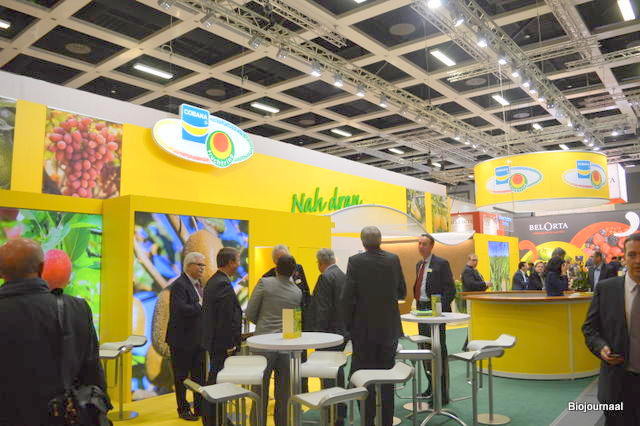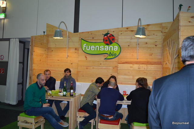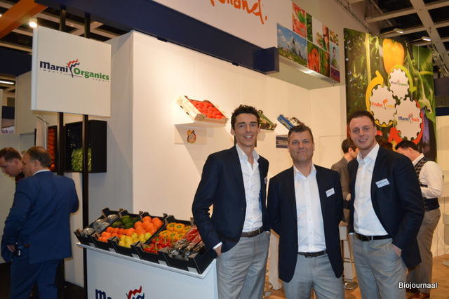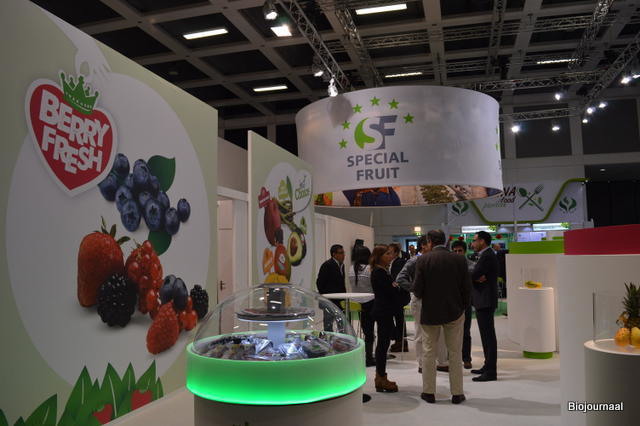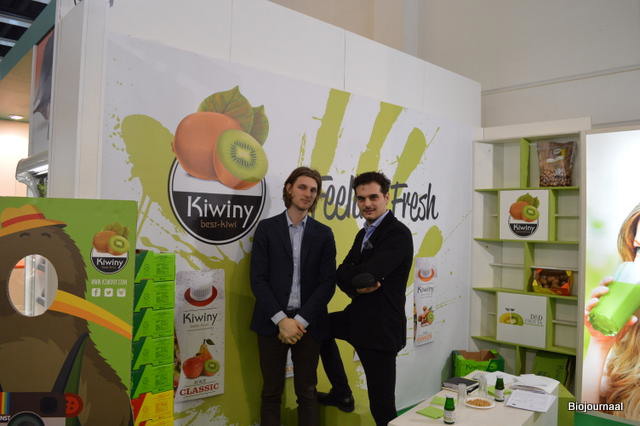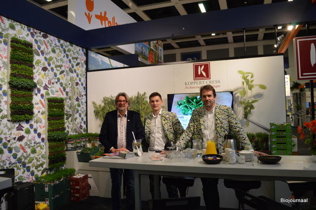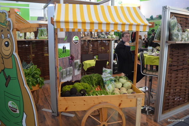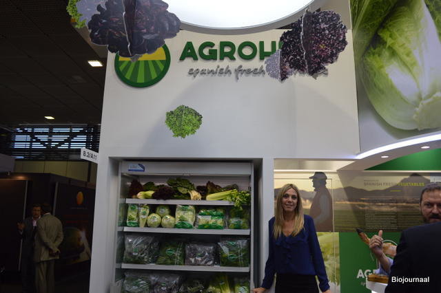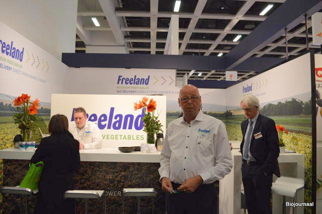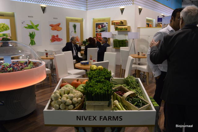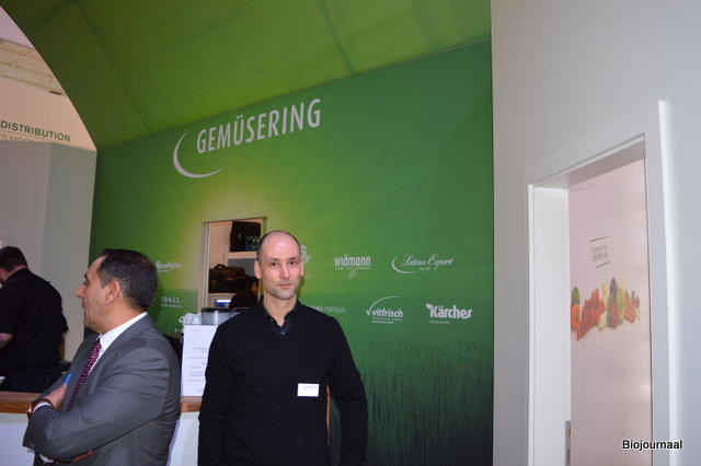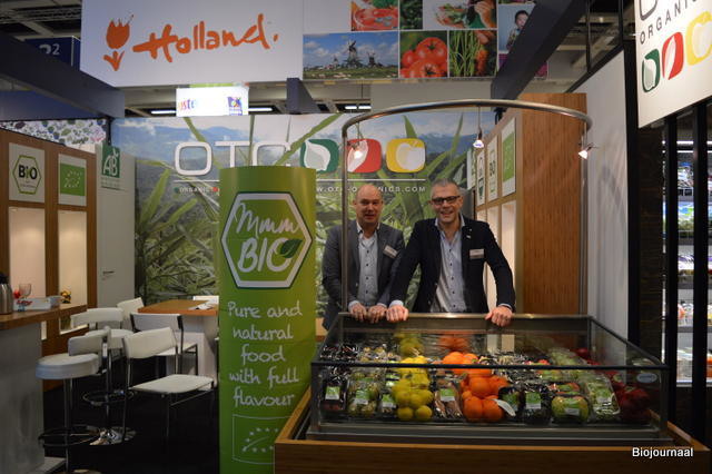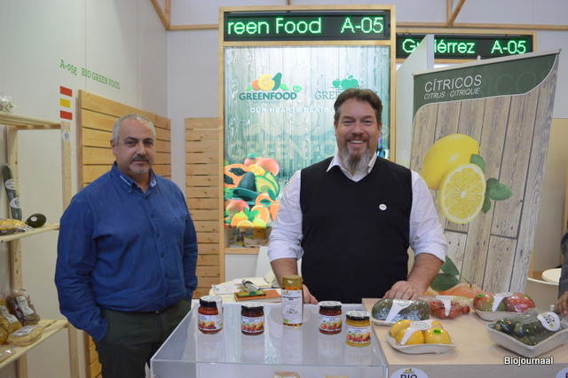 Miguel Gomez en Falko Alexander Schmidt in de stand van Greenfood. Het Spaanse bedrijf levert al tien jaar uitsluitend biologische AGF en richt zich sinds kort ook op de handel in zaden.