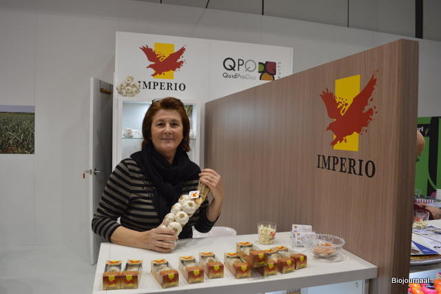 Carmen Roch Martinez toont één van de belangrijkste bio-producten van Imperio: knoflook.