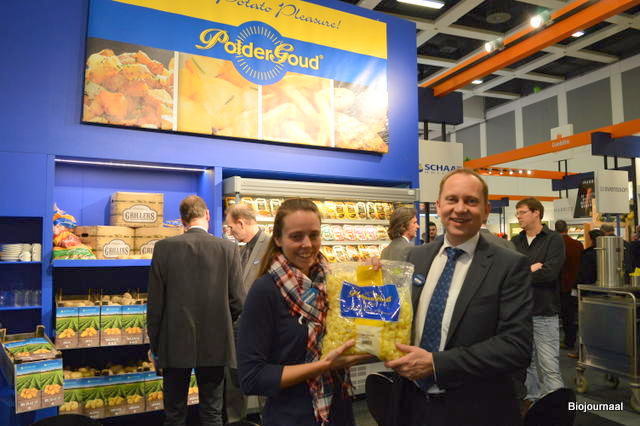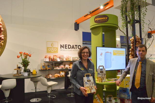 Pommily levert ongewassen biologische aardappelen die na de oogst ter plaatse verpakt worden. Vicky Leemans en Heero Gramsma poseren naast het assortiment.