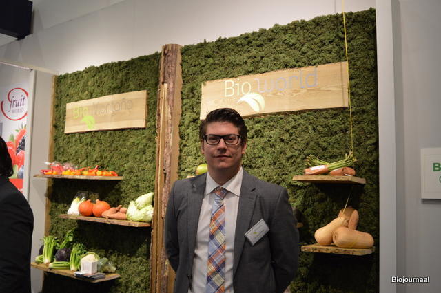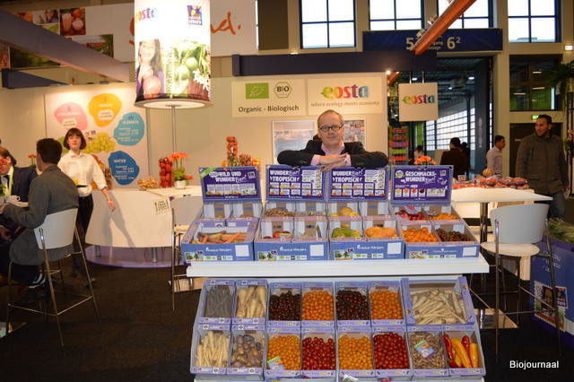 Michaël Wilde van Eosta ziet steeds meer telers overschakelen naar bio. Om de klant en de retailer een handje te helpen levert Eosta de producten in dozen die in een handomdraai omgetoverd kunnen worden in informatiedisplays.