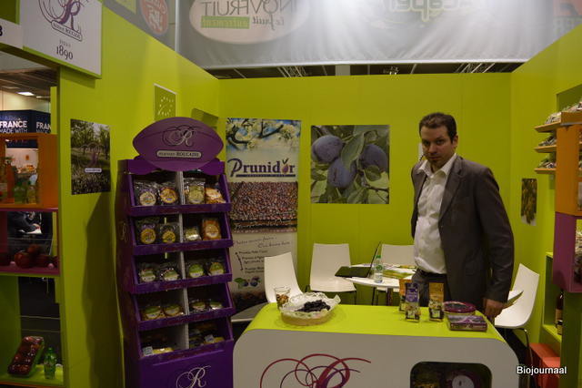 De heer Correia in de stand van Maison Roucadil, een Frans familiebedrijf dat Franse pruimen teelt en verkoopt.