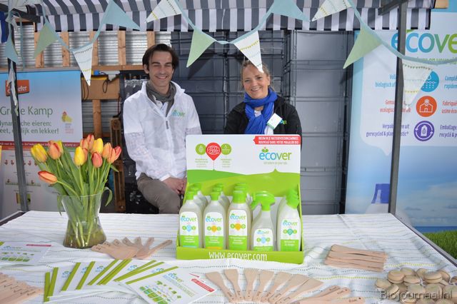 "Laurens Verhaegen en Neele Entbrouxk van Ecover. Nele: "We vinden het leuk om vandaag eens de winkeliers in het zonnetje te zetten. We hebben voor hen spatels voor in de keuken meegenomen en voor de kinderen houten jojo's."