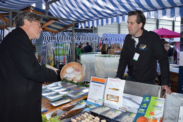 Jurgen van Bakel van Maasland Aquacultuur vertelt een geïnteresseerde meer over biologische vis.