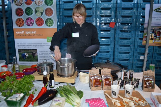 Hester Prummel bij 'onoff spices!'. Bij haar kon men proeven van soep en rijstgerechten die ze klaarmaakte met de Thaise currypasta's en soepen van onoff spices!.