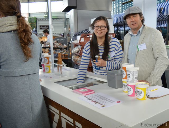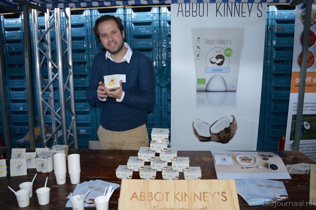 "Gijs van Maasakkers met Abbot Kinney's biologische kokosyoghurt. In februari introduceerde Abbot Kinney's ook een mango- en pruimvariant. "Hier krijgen we erg goede reacties op. We willen nu verder gaan doorontwikkelen en daarbij is het heel leerzaam om vandaag ook goed naar de winkeliers te luisteren."