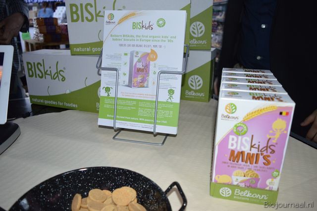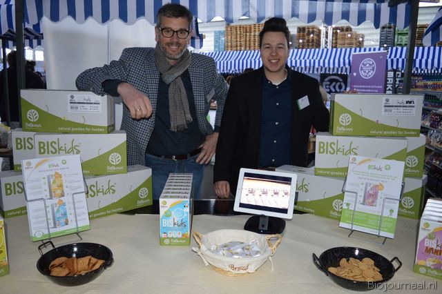 Links Jos Corthouts en rechts Jeffrey Excelmans met de biologische koekjes BISkids van Belkorn. Belkorn is gevestigd tussen Brussel en Hasselt.