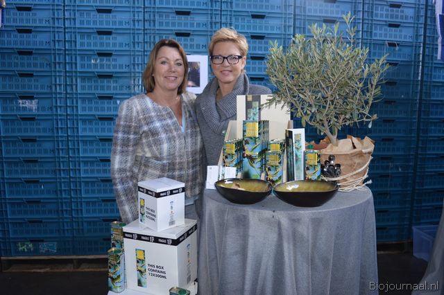 Conchita Dubbeld en Ruth van den Berg van Olive Oil Company. Op tafel staan de biologische olijfoliën 'Prime Olive Oil'.