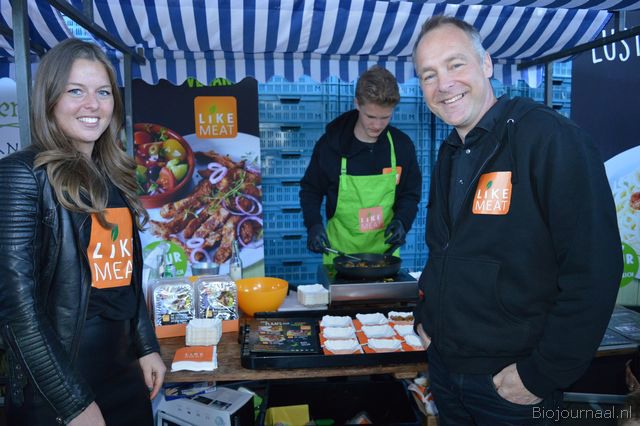 "De veganistische en biologische vleesvervangers van Like Meat liggen sinds 2 weken bij Ekoplaza in de schappen. Links Dewi Veniet, rechts Menco Sandstra en in het midden maakt Minne Sandstra wat producten klaar om te proeven. Menco: "We willen de vleesstructuur handhaven op basis van plantaardige ingrediënten."