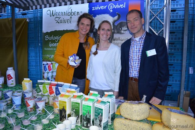 "Joyce Elders, Myrthe Bijl en Edwin Crombags van Weerribben Zuivel. Myrthe: "Deze Open Dag biedt ons de ideale gelegenheid om de vele vragen van winkeliers over de gevolgen van de overname van Zuiver Zuivel door Weerribben Zuivel toe te lichten. We hebben er voor gekozen om de merken Zuiver Zuivel en Weerribben Zuivel duidelijk van elkaar te gaan onderscheiden. Zuiver Zuivel wordt een merk met uitsluitend producten van Demeter kwaliteit. Weerribben Zuivel is het biologische merk uit natuurgebied Weerribben-Wieden, rechtstreeks van de boerderij"