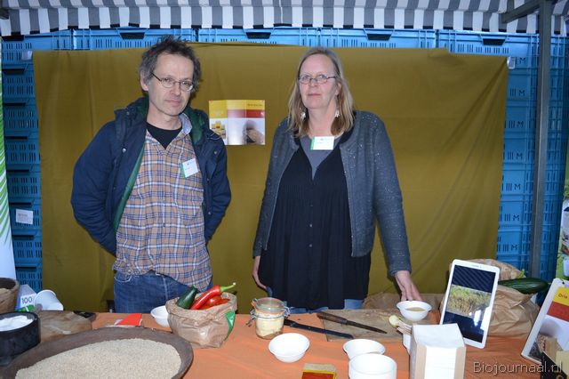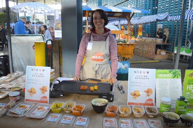 La vie est belle, de Belgische producent van biologische vegetarische burgers en spreads, stond ook op de Open Dag. Mirelle Wagenaar draait de burgers nog een keertje om. Rechts is verkoopmedewerker Ronald Droesbeke in gesprek.