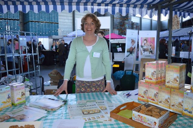 Rosé van Oorschot met de Stop&go van graanpletterij De Halm. De bezoeker bekijkt de 50 grams portieverpakkingen met de muesli's en crunchy's.