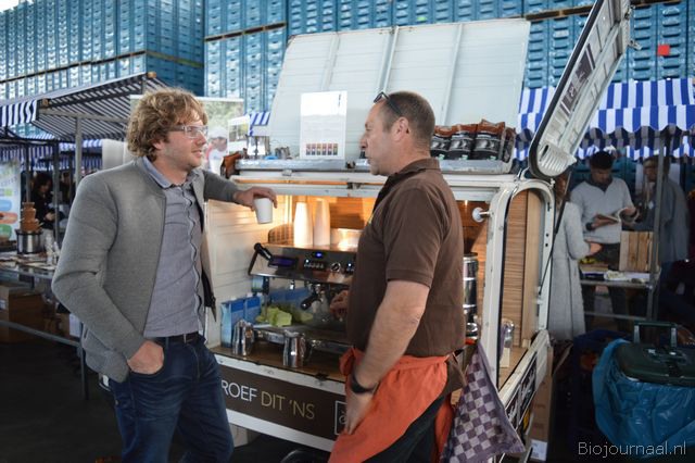 Olle Jacobs (TerraSana, links) geniet van een kopje biologische koffie van Simon Lévelt.