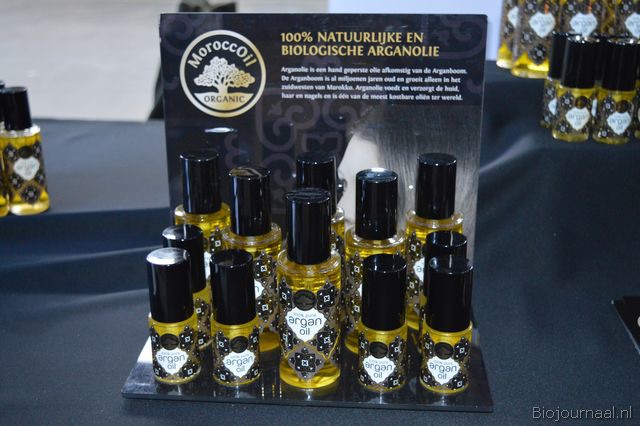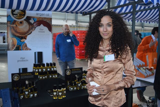 Najat Saidi met achter haar de biologische arganolie van Moroccoil uit Roelofarendsveen.