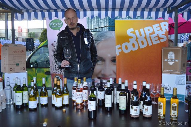 Richard van der Linden met een klein deel van het bio-wijnassortiment van Coenecoop Wine Traders.
