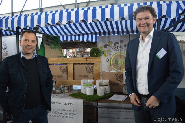 Albert van 't Blik en Bert Groen met achter hen het 100% Eco toiletpapier.