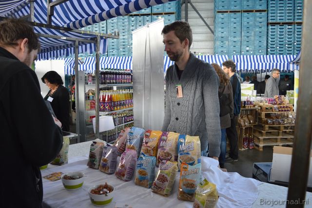 Moritz Nagl met de Muesli's en 'Krunchy's' van het Duitse bedrijf Barnhouse Naturprodukte uit Mühldorf.