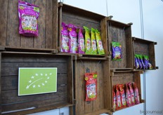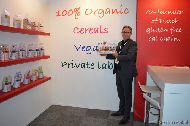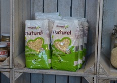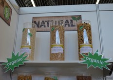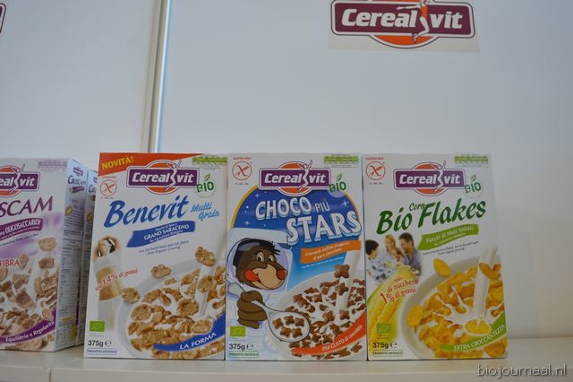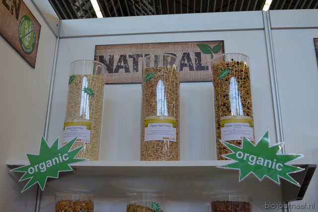 EuroCér had ook diverse bio-producten bij. Van links naar rechts: Organic Oat Flakes, Organic Spelt Flakes, Organic Crunchy Muesli.