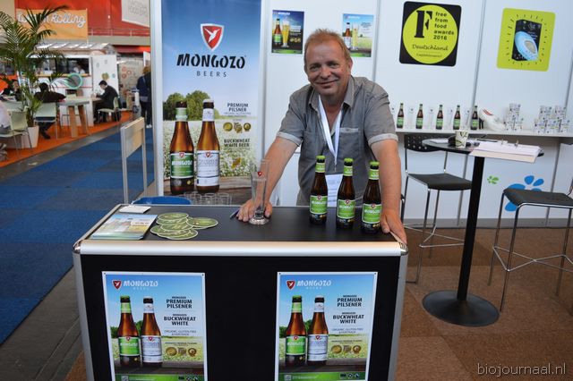 Ook Jan Fleurkens mocht op deze 'Free From'-beurs niet ontbreken met de biologisch, Fairtrade en glutenvrije pilsener van Mongozo.