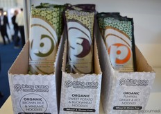 Op deze foto: Brown Rice & Wakame Noodles, Sweet Potato & Buckwheat Noodles en Pumpkin Ginger & Rice Noodles, allemaal biologisch.