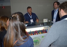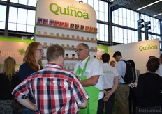 Henk Koster (midden) vertelt twee bezoekers alles over de biologische quinoa-producten van NatureCrops.