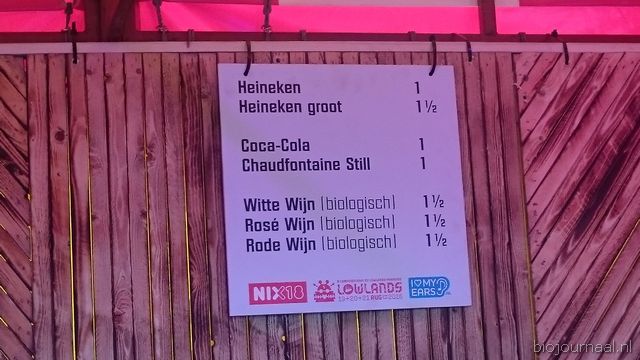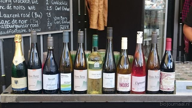 Naast bier, frisdrank en water ook drie biologische wijnen in deze bar.