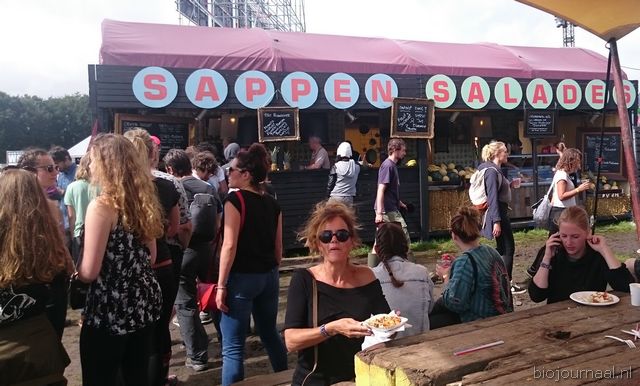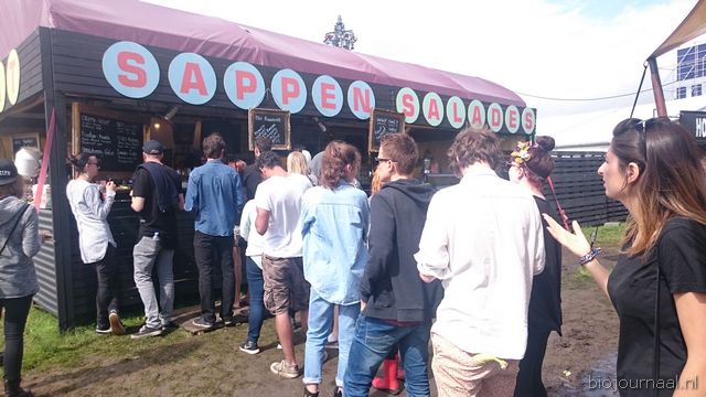 In de rij voor verse biologische en Fairtrade smoothies en fruitsalades.