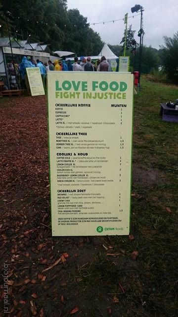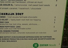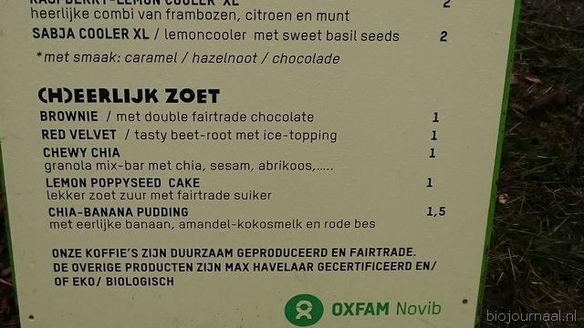 Op het 'menubord' stond onderaan wat meer informatie over het bio-aandeel: Onze koffie's zijn duurzaam geproduceerd en Fairtrade. De overige producten zijn Max Havelaar-gecertificeerd en/of EKO/biologisch.