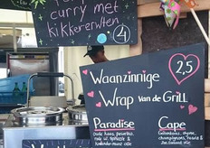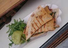 De 'Waanzinnige Wrap van de grill' - cape - met geitenkaas, olijven, champignons, rucla en zontomaatolie.