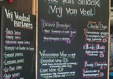 Links hangt een overzicht van de Vrij Voedsel-partners, waaronder Bio Futura, Odenwald Organic Bakery, Vroegop - De Kweker en Go Pure chips.