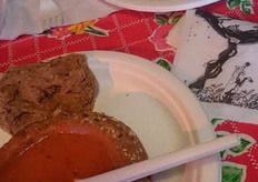Een bakje met pindavrije satésaus om te proeven. En inderdaad: net echt! Achterin de andere wrap 'Paradise' - met oude kaas, pecorino, rode ui, spinazie en koriander-munt-olie.