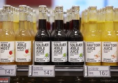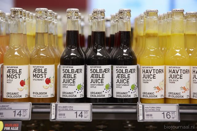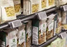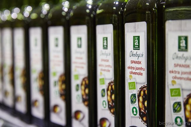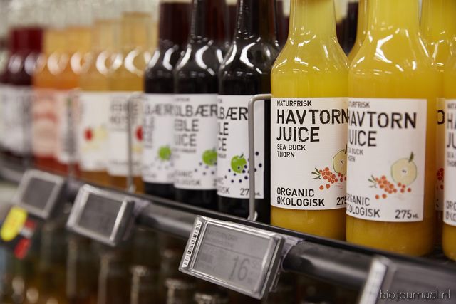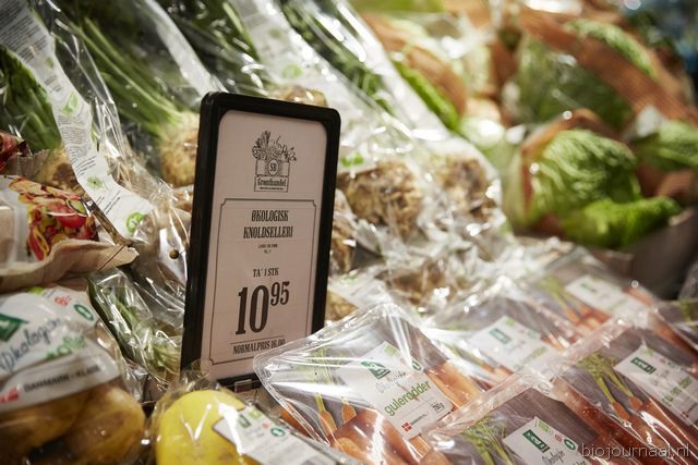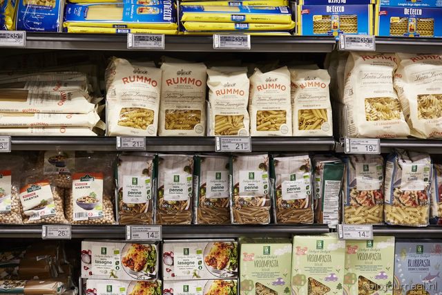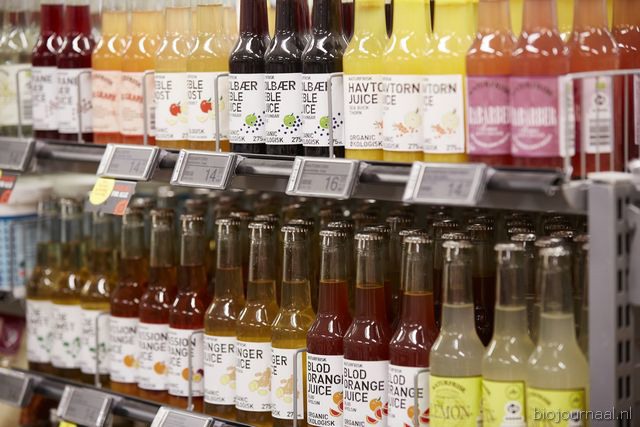 De rode Ø-labels op het schap wijzen de biologische producten aan.