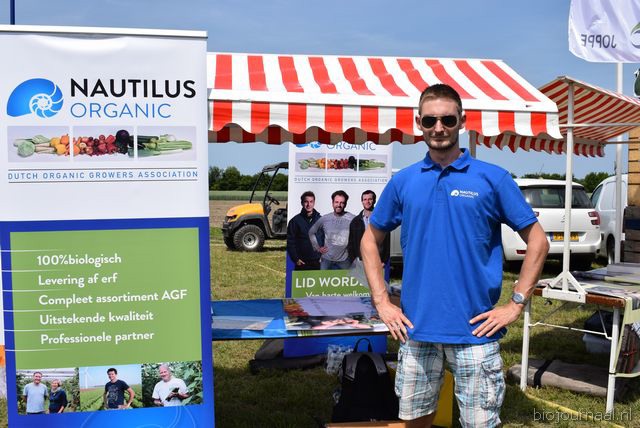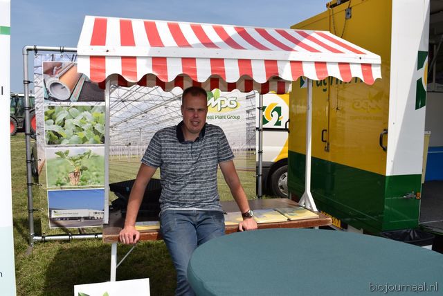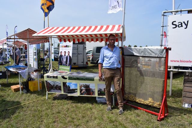 "Anton Hulsegge van Howitech is ook voor het eerst op de Biovelddag. De multifunctionele klimaatdoeken op de achtergrond zijn geschikt voor de biologische land- en tuinbouw. "De doeken reguleren warmte en vocht en schade door vogels."