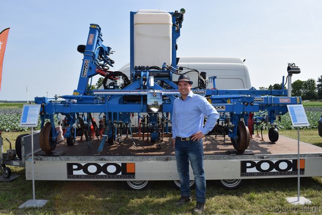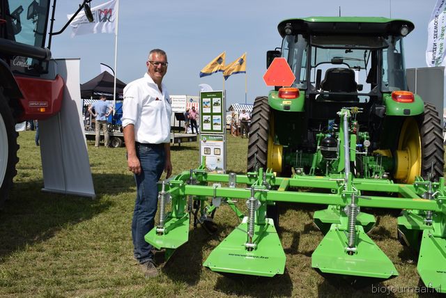 "Gert de Jongste van GroeNoord BV toont dit Combi-werktuig: Ecoridger, Speedridger & Hoekschoffel. "In deze opstelling kun je met een kleine trekker voldoende druk op de bodem en het gewas uitoefenen." Hij merkt op dat bio-telers voorop lopen in GPS-schoffelsystemen."