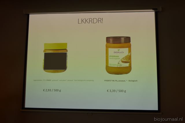 De pindakaas van Ekoplaza is weliswaar duurder dan de pot die in het reguliere supermarktschap staat, maar hiervoor krijgt de consument wel 99,7% pinda's in plaats van 77% pinda's (aangevuld met palmvet en rietsuiker).